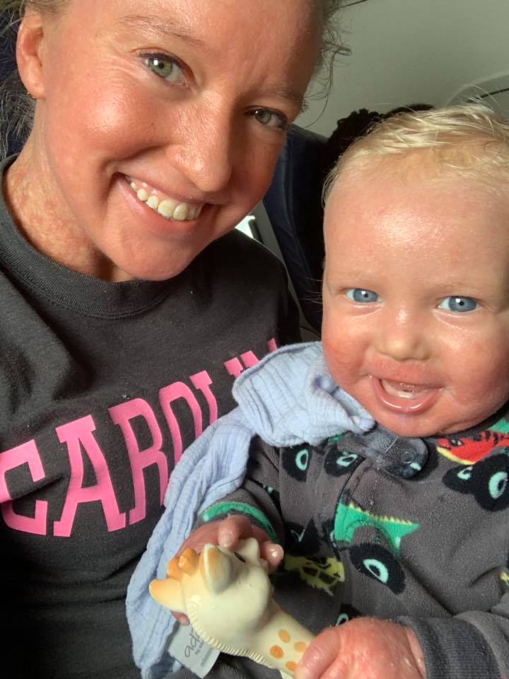 An airline has apologised after removing a US mother and her baby son from a flight because of their genetic skin condition.